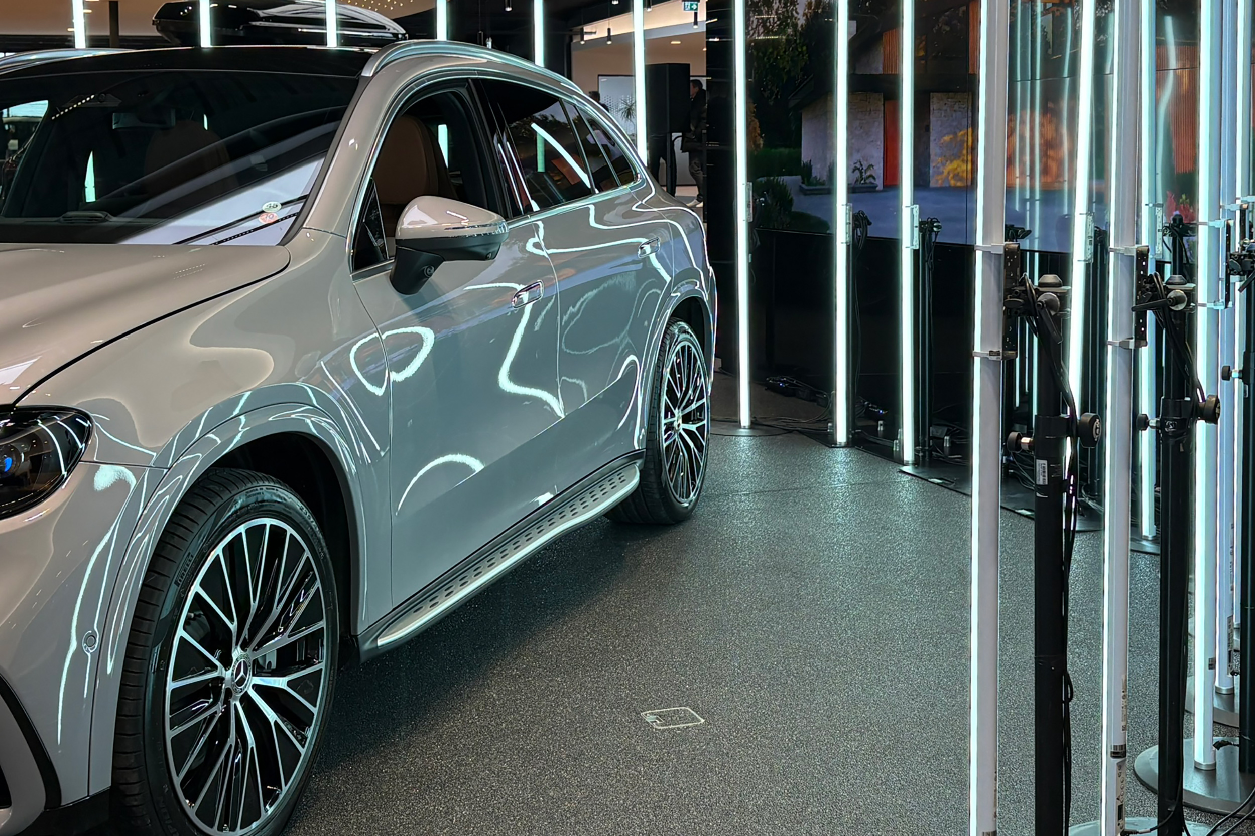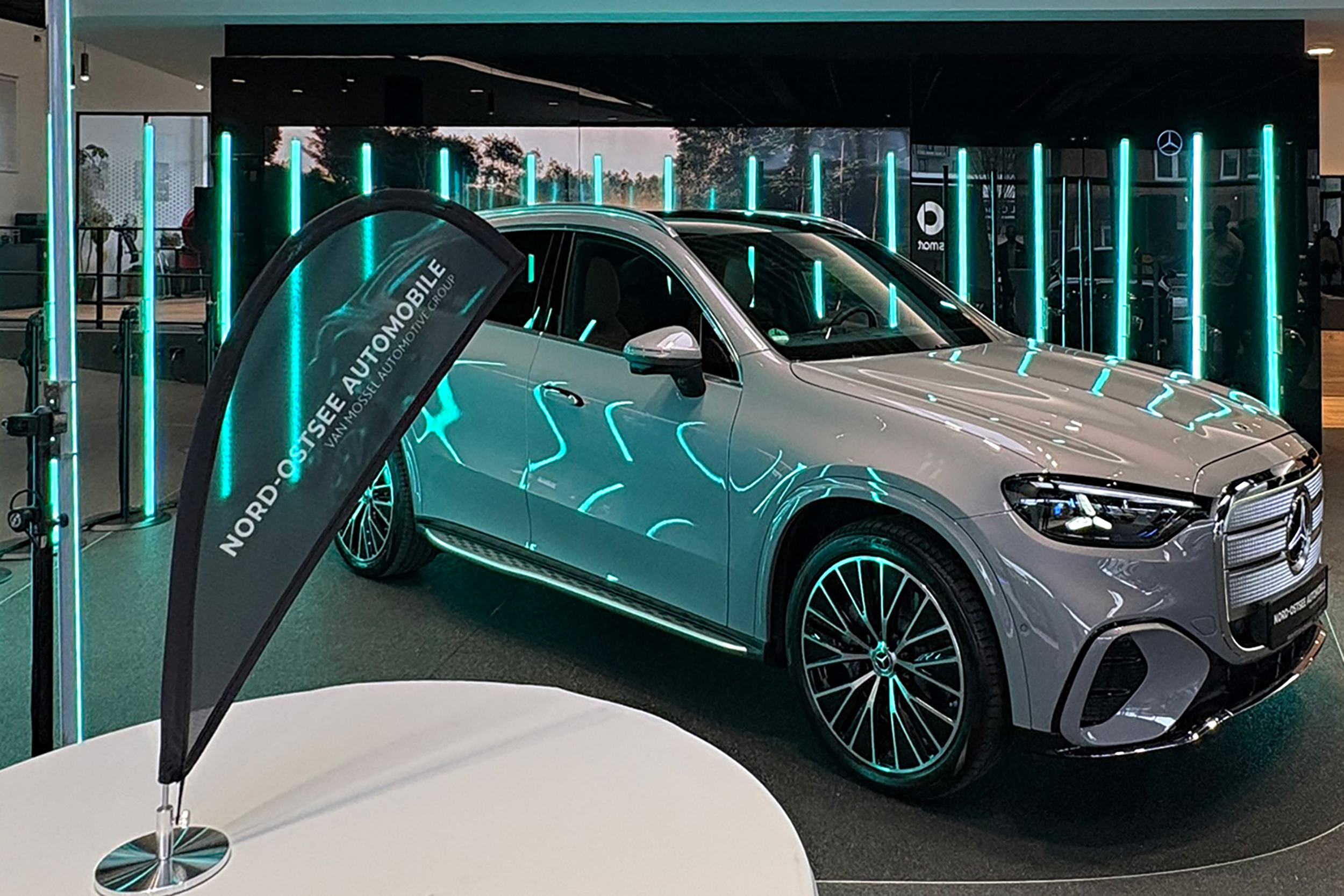 LED Tubes tauchten die Präsentationsfläche in dynamisch wechselnde Farben und rückten den Star, den neuen Mercedes-Benz GLC, in den Mittelpunkt des Geschehens. Fein nuancierte Lichtreflexe unterstrichen auf elegante Weise das Fahrzeugdesign.